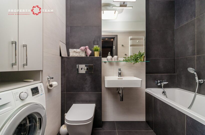 Gustowna łazienka z wanną, pralką, dużym lustrem i półkami w zabudowie.