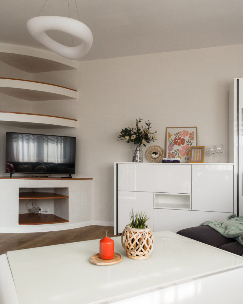 Przestronny salon połączony z jadalnią i kuchnią, z bezpośrednim wyjściem na balkon. W salonie komfortowy narożnik z funkcją spania, stolik kawowy i witrynki, telewizor.